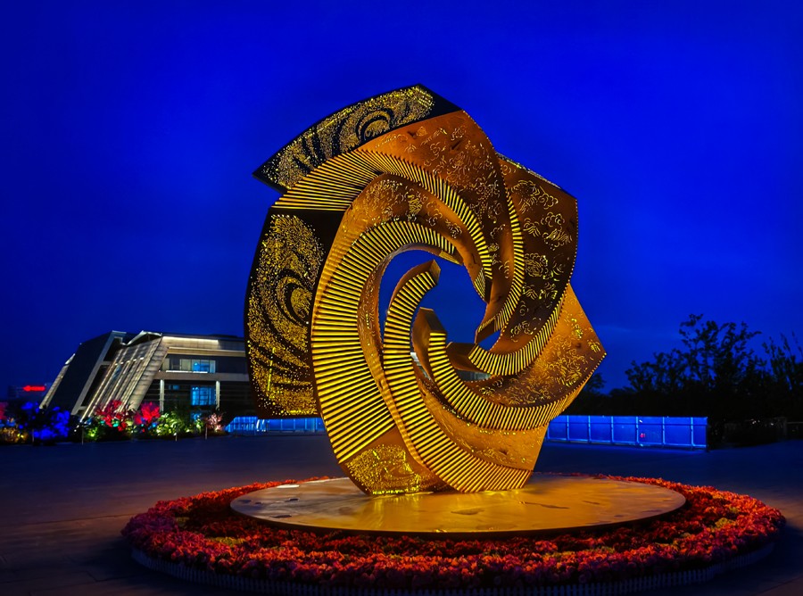 Recently, artist Cui Xiaoqing’s large-scale outdoor installation *Hundred Birds Paying Homage to the Phoenix* was officially unveiled and put on display at the south entrance plaza of the Jincheng City Experience Center. The work is a 6×6×3-meter stainless steel installation created using traditional paper-cutting techniques. Its form resembles a blooming “sunflower,” skillfully blending Jincheng’s local culture with contemporary art.