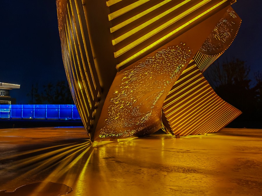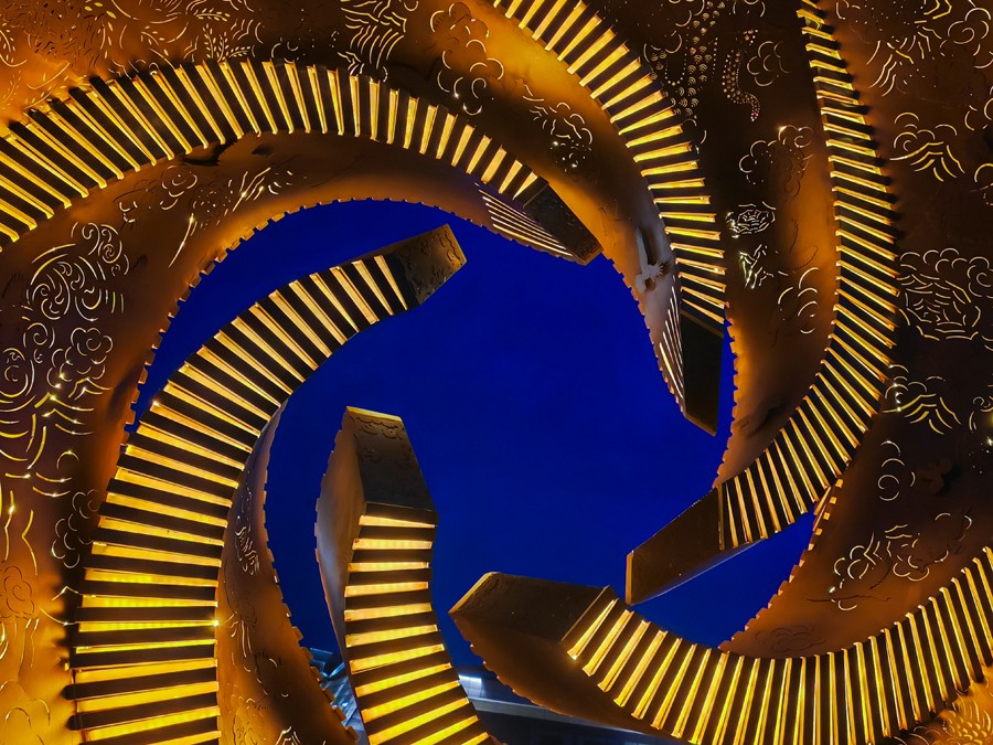 The front of the work features a design that blends the imagery of the Azure Dragon, White Tiger, Vermilion Bird, Black Tortoise, and the Twenty-Eight Lunar Mansions. Drawing inspiration from traditional imagery at the Jade Emperor Temple in Fucheng, these elements have been reimagined to form a dynamic cosmic totem. The back of the installation takes local Jincheng myths as its narrative thread—including Nüwa Mending the Sky, the Foolish Old Man Moving Mountains, Shennong Tasting Hundreds of Herbs, and Jingwei Filling the Sea—while incorporating elements of Jincheng’s historic architecture and cultural landmarks. As night falls, LED light strips cast patterns of light and shadow through the openwork carvings, transforming the constellations and architectural silhouettes into twinkling points of light that harmonize with the city’s nightscape.